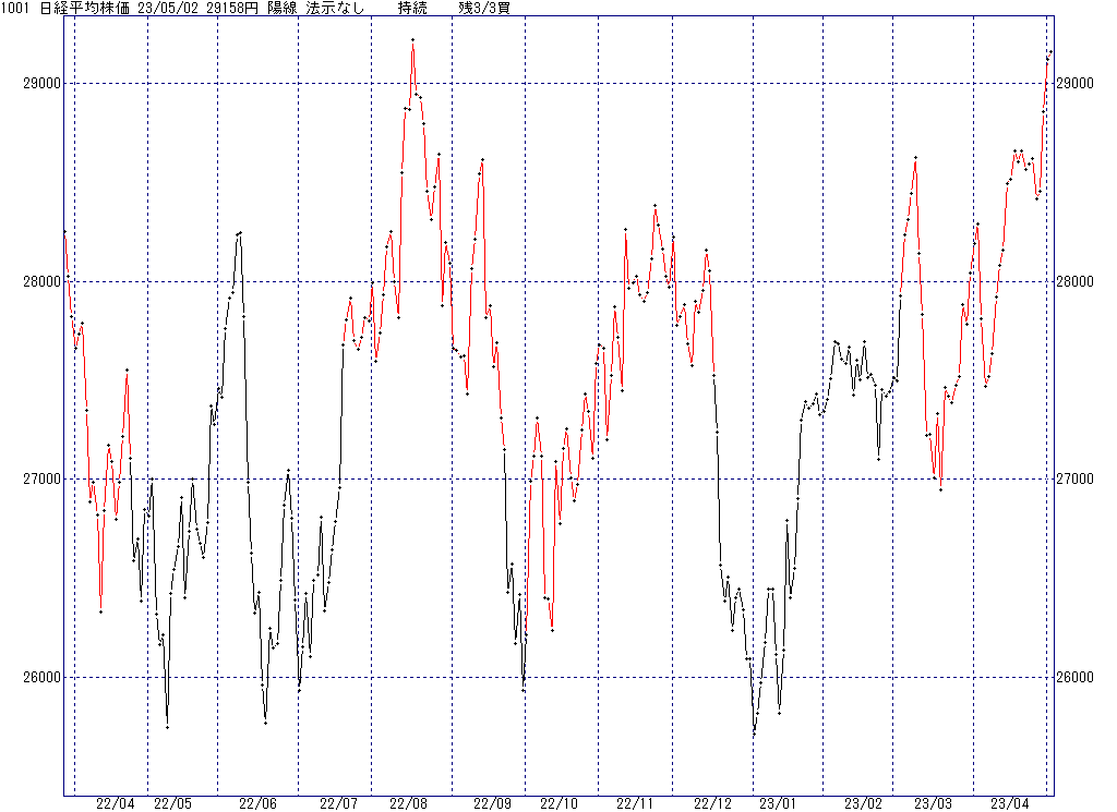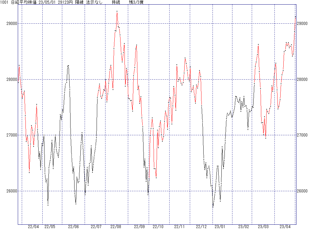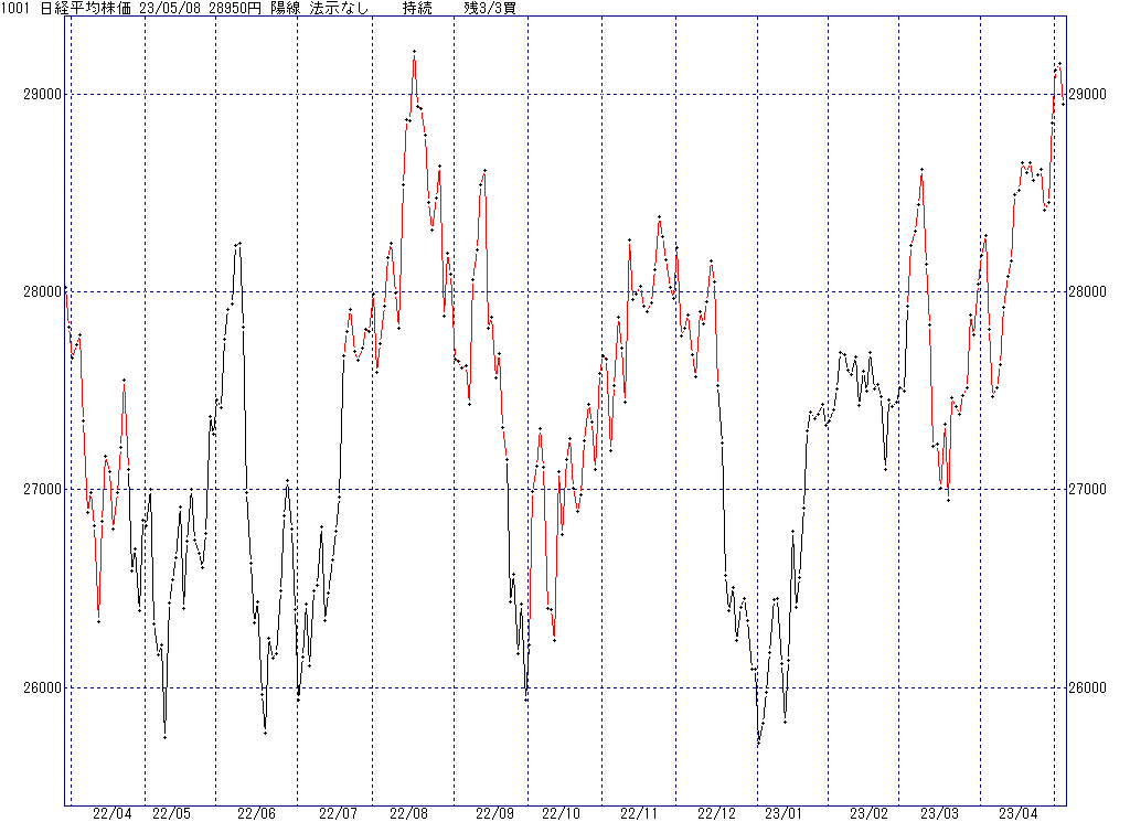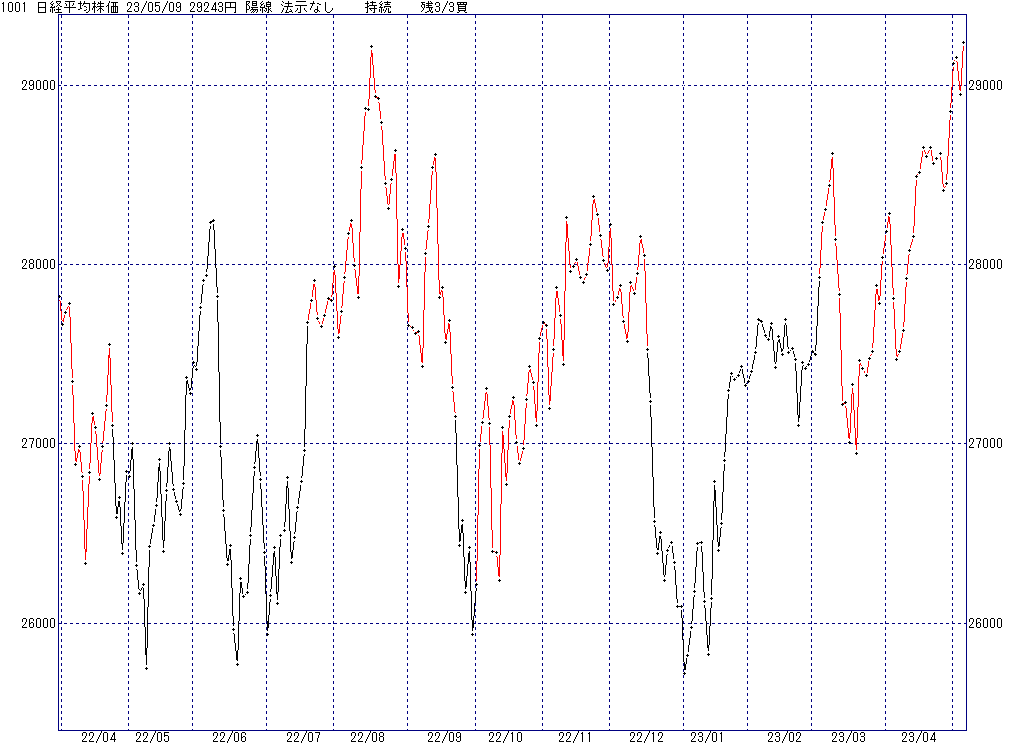 2023年5月9日(火)日中の取引終了時点で算出した中源線シグナルです。