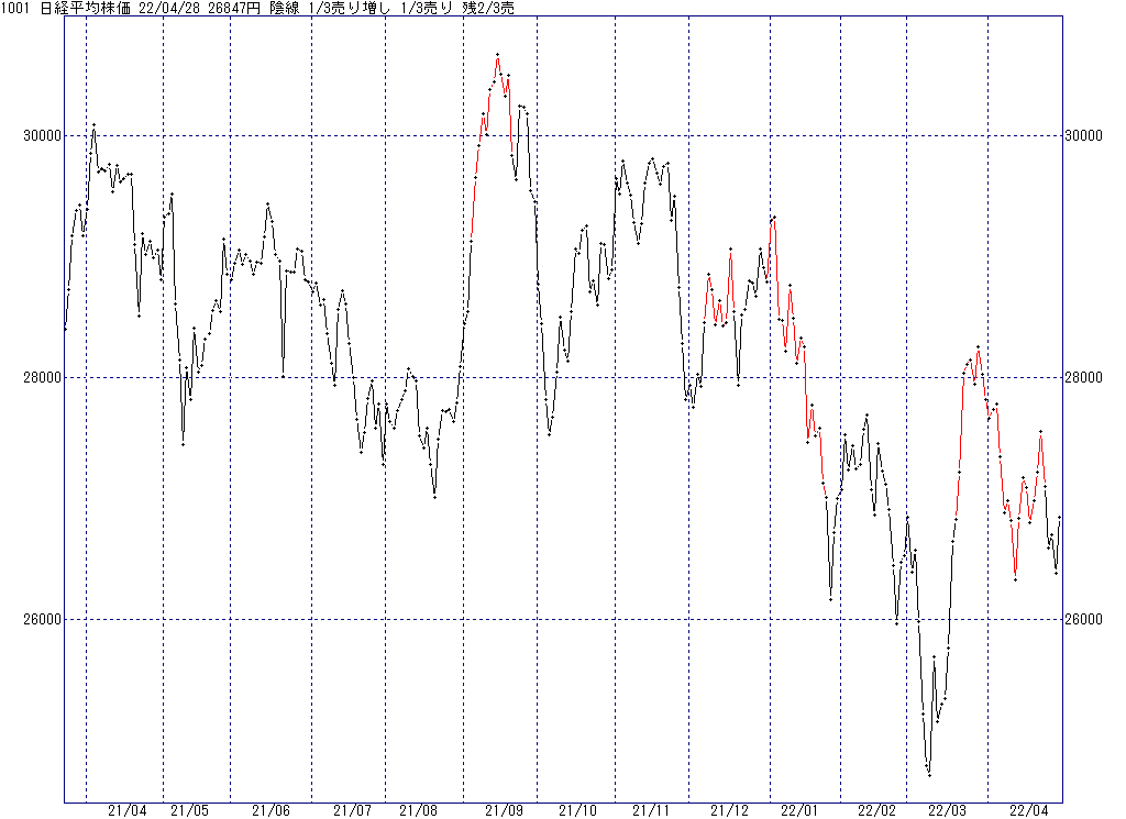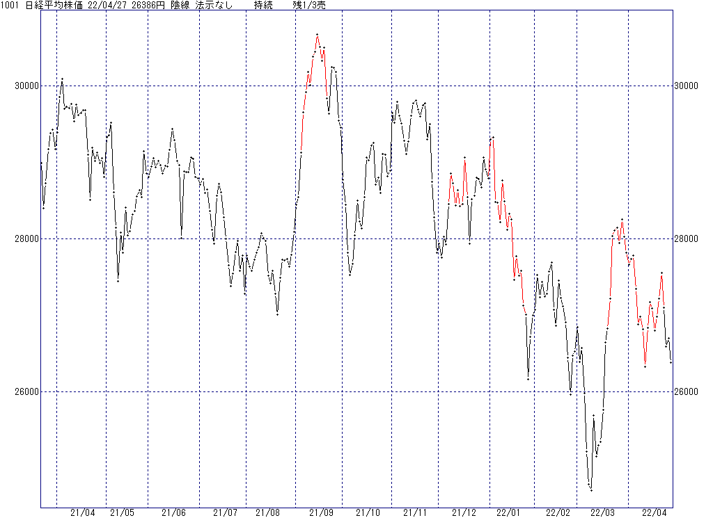 2022年4月27日(水)日中の取引終了時点で算出した中源線シグナルです。