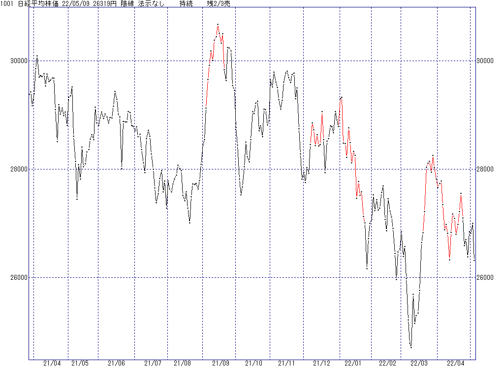 2022年5月9日(月)日中の取引終了時点で算出した中源線シグナルです。