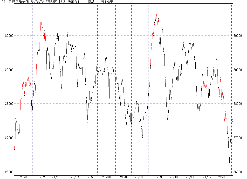 2022年2月3日(木)日中の取引終了時点で算出した中源線シグナルです。