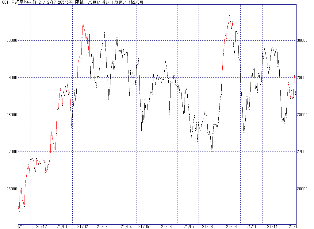 2021年12月23日(木)日中の取引終了時点で算出した中源線シグナルです。
