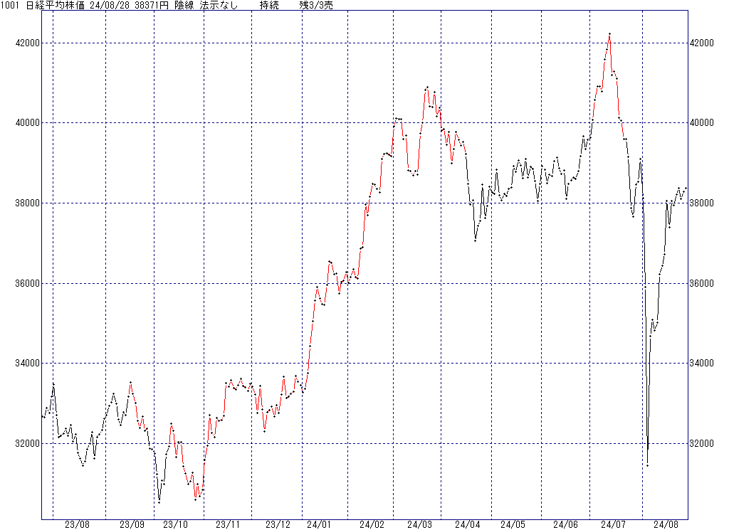 2024年8月28日(水)日中の取引終了時点で算出した中源線シグナルです。
