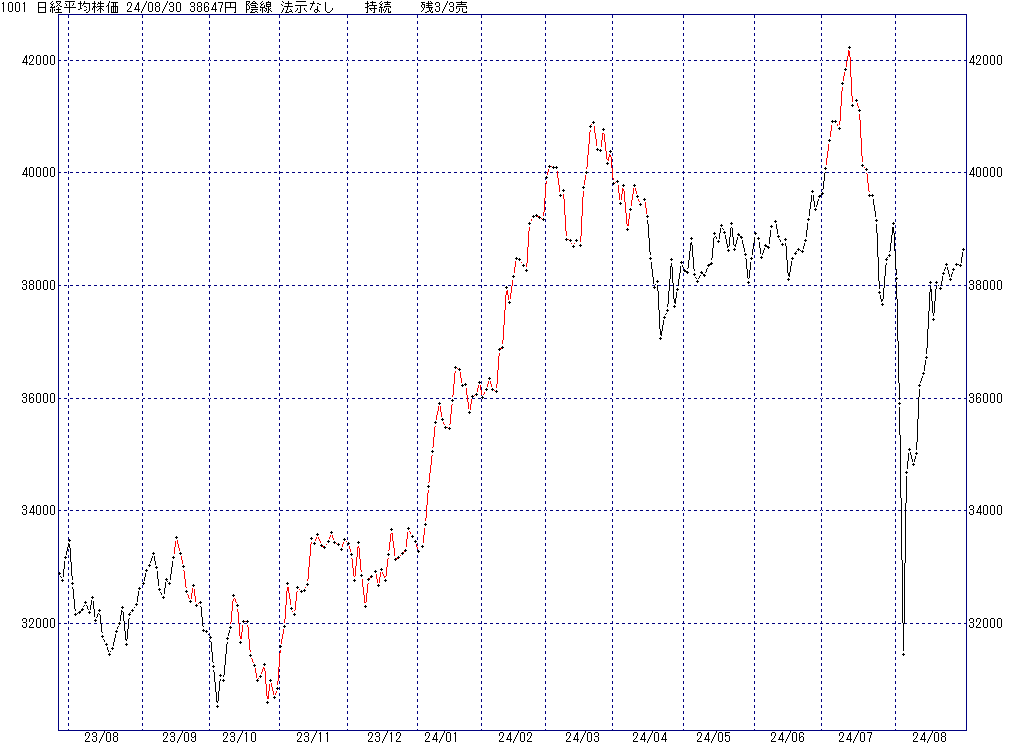 2024年8月30日(金)日中の取引終了時点で算出した中源線シグナルです。