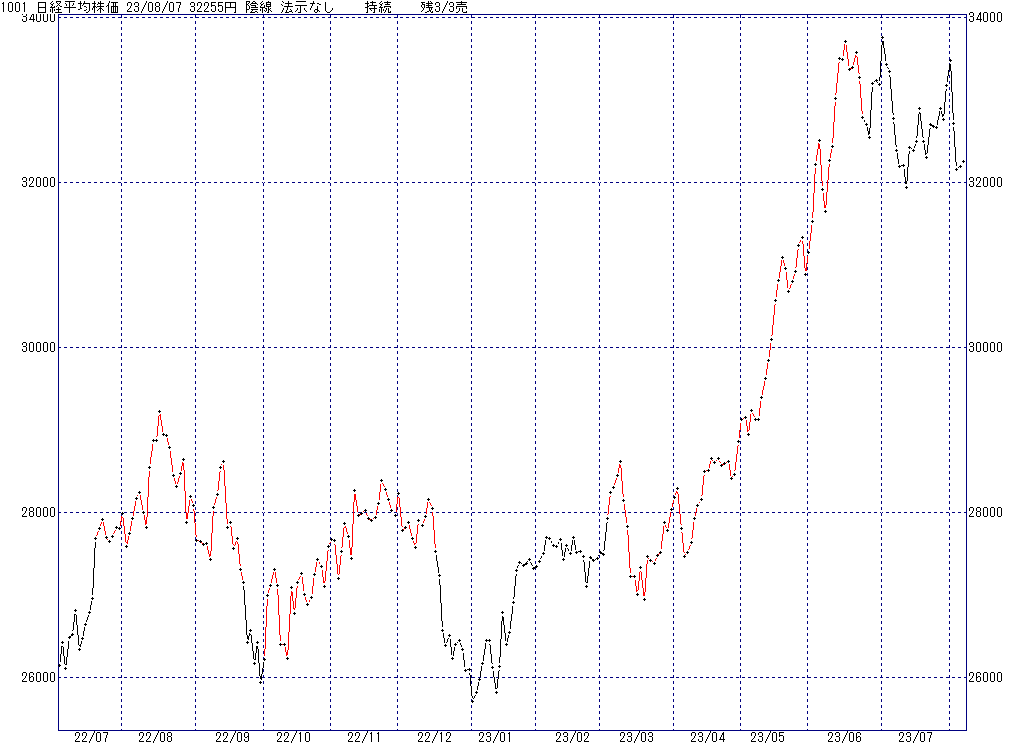 2023年8月7日(月)日中の取引終了時点で算出した中源線シグナルです。