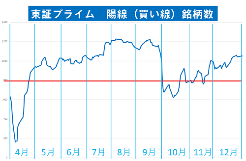 中源線によって個別銘柄のトレンドを判定し、その結果、東証プライムで買い線(上昇トレンド)の銘柄がいくつあるか、という数値です。