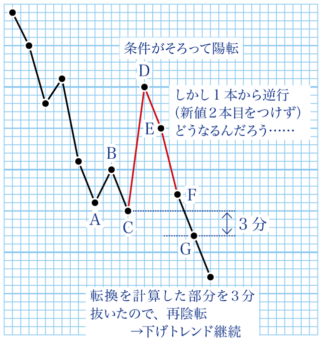 陽転(買い線に転換)したあと、この図のように下げ(逆行)た場合、「陽転はダマシだった」と即座に認めて「再転換」させます(サッと陰転させる)。