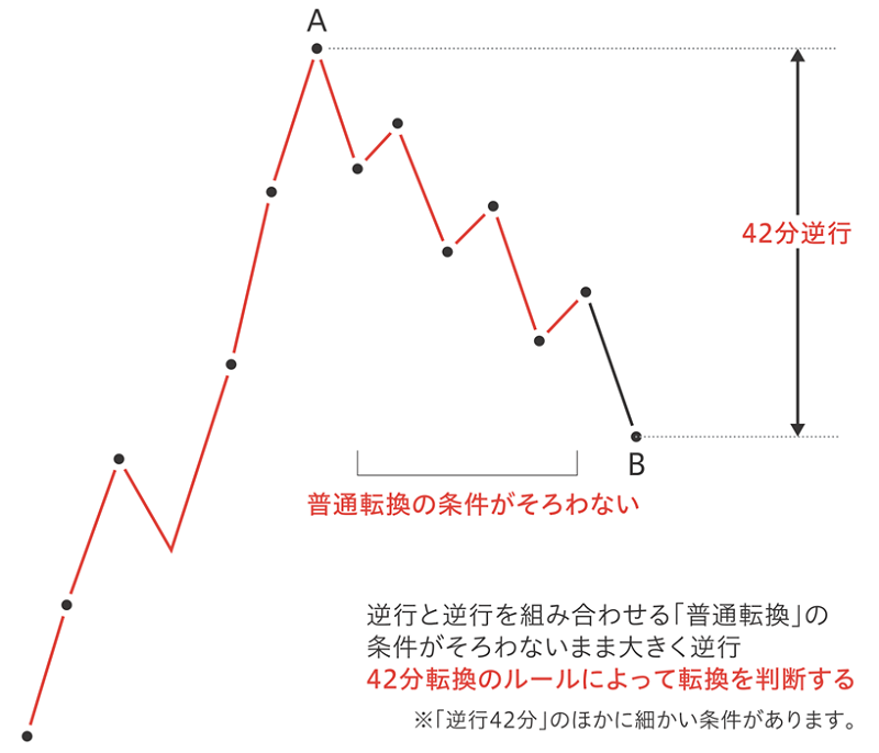 そこで、これまた一定の条件がありますが、最高値から42分(ぶ)下落、あるいは最安値から42分(ぶ)上昇したときに転換を決める「42分転換」という補助ルールがあるのです。