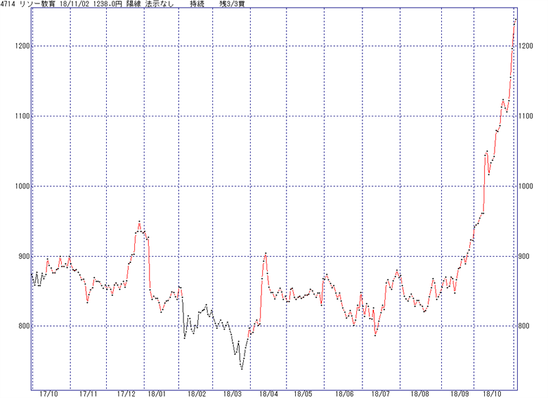 4714リソー教育は、9月中旬から上げ始め、10月に市場全体が下げても関係なく上伸をみせました。