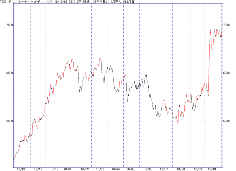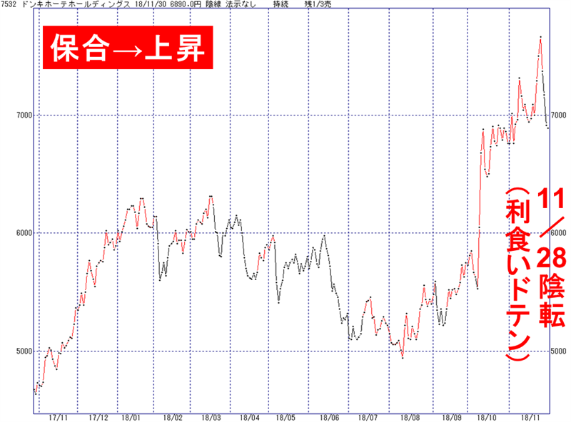 7532ドンキホーテは、弱保合から急騰という変化をみせました。10月に市場全体が下げ傾向になる中、グングンと上値を取っていったのです。でも直近は、11月28日に陰転(買いポジションを利食いしてドテン売り)、その後は弱い展開です。