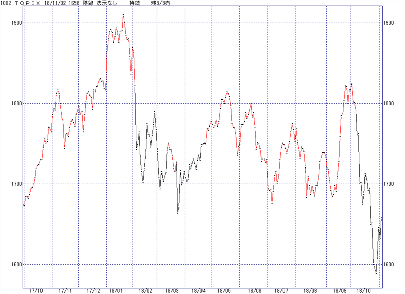 日経平均は、10月初めにかけての上げで、2018年1月の高値を更新し、そのあと急落して2月、3月の水準まで落ちました。