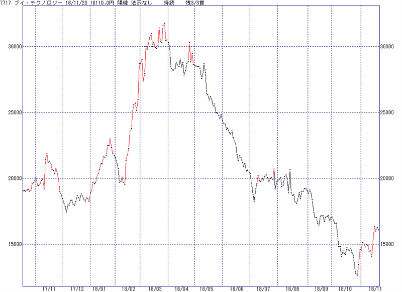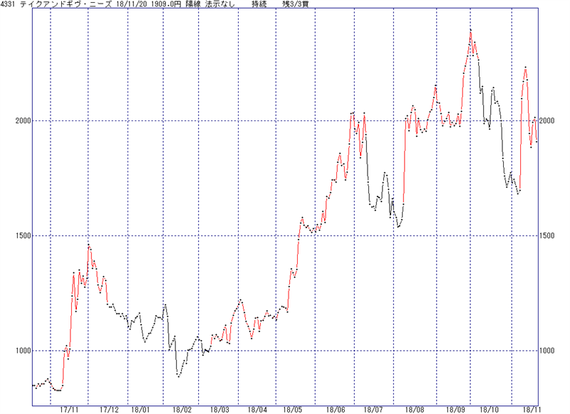 4331テイクアンドギヴ・ニーズは、「いい感じで取れている」とコメントしましたが、11月中に反発して陽転。しかし陽転後、どっちつかずの展開です。急に、方向感がなくなりました。