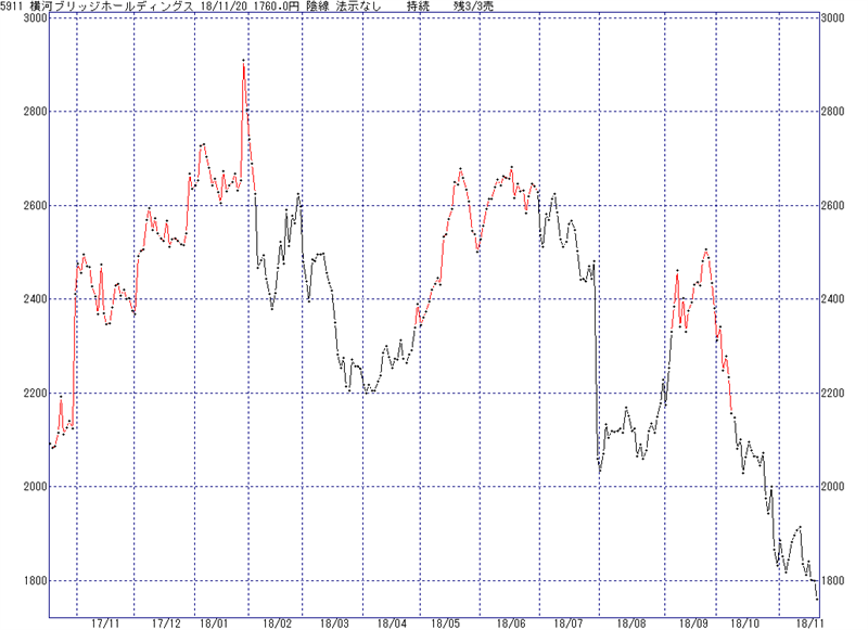 5911横河ブリッジHDは、10月の下げで陰転が遅かったのですが、ズルズルと下げて売りポジションにしっかりと利が乗っています。「2,000円は割らないだろう」とか、値ごろで考えてはいけませんね。