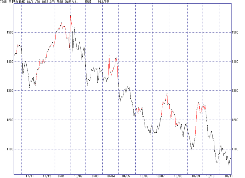 7205日野自動車は、陰線のままですが、ガンガン下げる感じは見受けられません。2月から9カ月以上も下げ、整理が進んでいるのでしょうか。前回のコメント「次に陽転したら“こんどこそ”」を継続、といったところです。