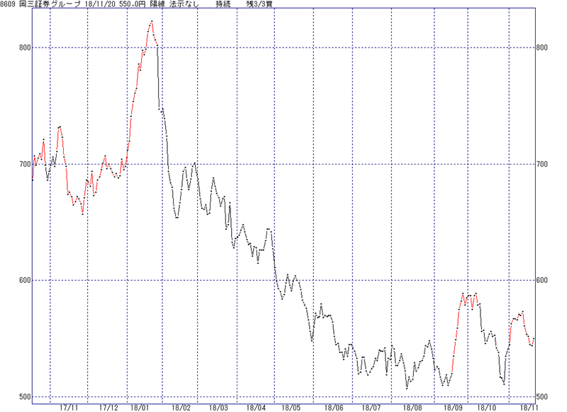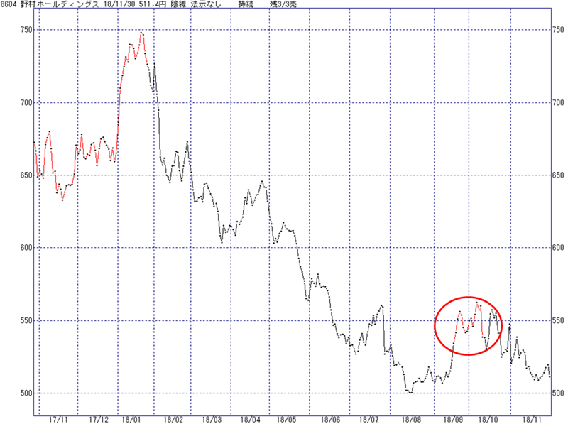 8604野村HDは、証券株の典型的な動きで、1月以降ずっと下げています。また、9月に陽転したのに出損なって(赤い丸印)10月の下げで再び陰転しています。値ごろ的には買いを狙いたいところですが、買ってみたら見込み違いで損切り……といった対応は、相場で仕方がないことだと認識しなければなりません。