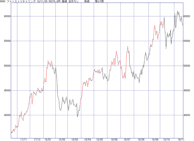 大きな流れは、2018年3月からずっと上げ波動、10月に弱含むも再び上昇して新値更新、というところですが、「買っていたら儲かったね」なんて表面的な見方ではなく、実際にポジションを取ることを考えて観察してみます。