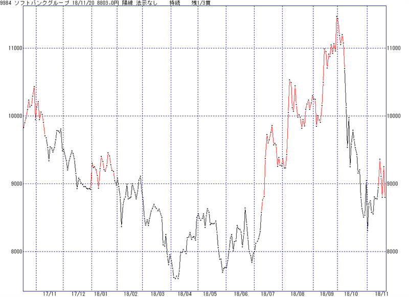 9984ソフトバンクも、中源線との相性がとてもよい銘柄です。11月はじめが目先の安値、11月14日の陽転したあとバタバタの横ばいです。12月の子会社上場(携帯電話のソフトバンク)が大きな話題となっていて、どうしても雑音が入ってくる状況が気になりますが、ガクンと下がってからの陽転なので魅力はあります。