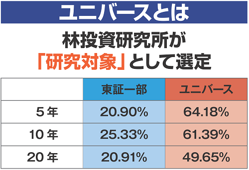 ユニバースとは、「中源線シグナル配信」スタート時に、最長31年間の過去データで分析した結果、パフォーマンスが良好かつ安定している銘柄を、東証一部に限定して選んだものです。売買実践を考えた、「研究対象銘柄」ということです。
