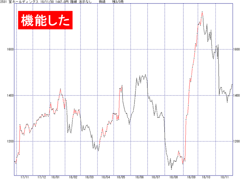 2531宝HDは、つかみどころのないような動きですが、中源線が機能しています。9月の上げ、10月から11月にかけての下げは、ポジションを持っていたら快感だったでしょう。