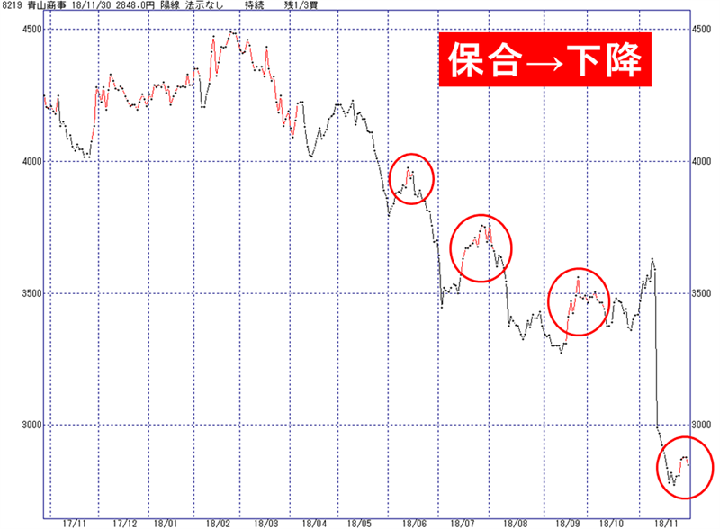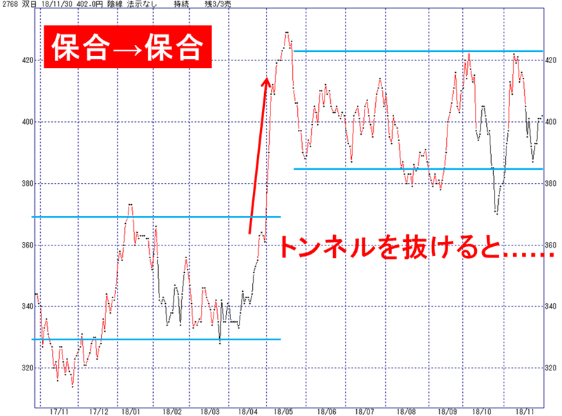 2768双日は「保合」ではなく、「保合→保合」というヘンな分類をした銘柄です。往来から上昇して「グングン上値を追うか!」と感じさせたあと、再びおもしろみのない保合に移ったのです。「よし!」と乗ったら動かなくなった……相場あるあるです。