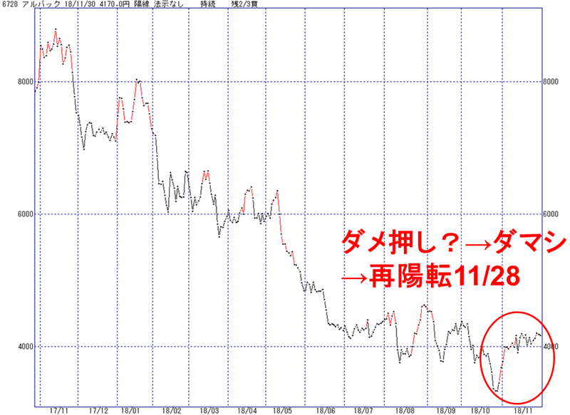6728アルバックは、下降トレンドから保合に移った銘柄です。7月以降の中途半端な横ばいでは中源線でダマシがつづいていますが、直近は、10月後半にダメ押しのような下げ、ダマシの陽転、11月28日に再陽転して「おっ」と目を引く状況です。