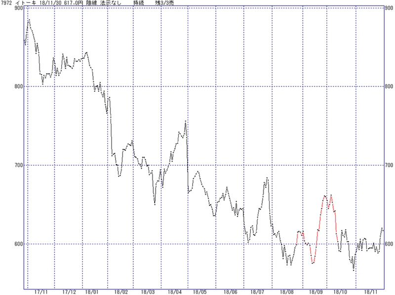 7972イトーキは、イヤになるほど陰湿な下げっぷり……そして、8月後半の陽転がダマシ、10月に陰転してからはつまらない横ばいです。そして、依然として中源線の判断は「売り」です。でも、「次に陽転したらおもしろいかも!」と感じさせる銘柄ではないでしょうか。