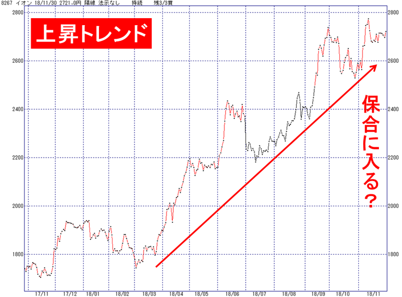 8267イオンは、「中源線シグナル配信」のユニバースで唯一、「上昇トレンドだった」と言いきれる銘柄です。上げが鈍ってきたと判断して「保合に入る?」なんて勝手なコメントを入れましたが、中源線の判断は依然として「買い」です。
