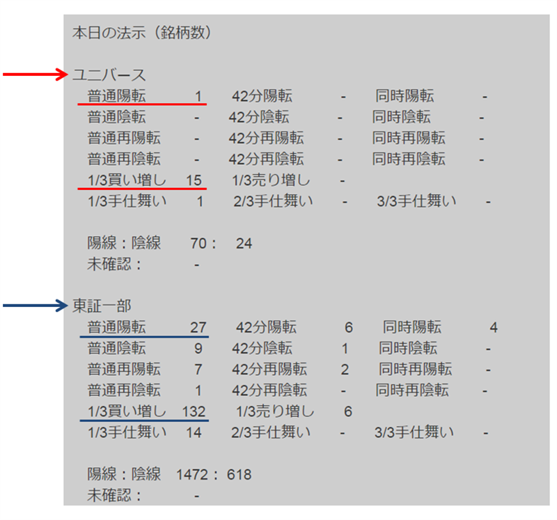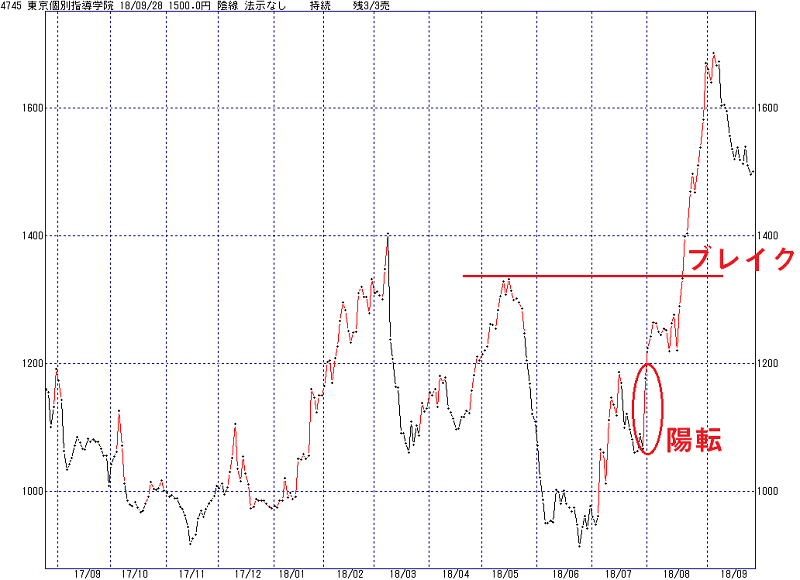 いいタイミングで転換しているので、逆張りのようにも見えますが、下げる動きで陰転、上げる動きで陽転しています。想定通りのタイミングで転換すれば、「天井圏で陰転」「安値圏で陽転」するのですが、いわゆる順張りでトレンド転換を判断しているのです。
