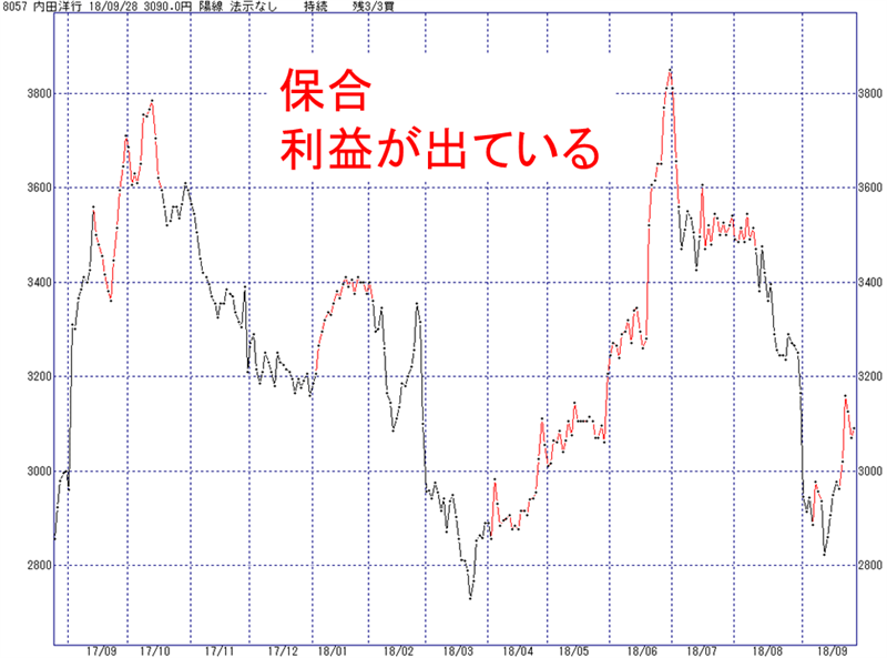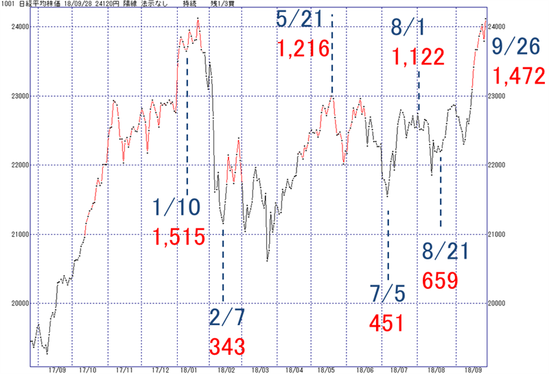 2018年の相場は難しい……中源線を使っても取りにくい場面が多いのですが、前項で示した日経平均のチャートと、個別銘柄の陽線(買い線)数の推移を見ると、目まぐるしい変化に、ちゃんとついていっていることが理解できます。