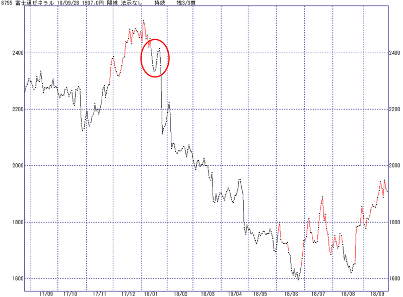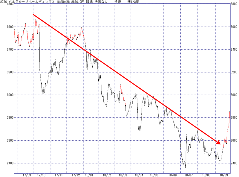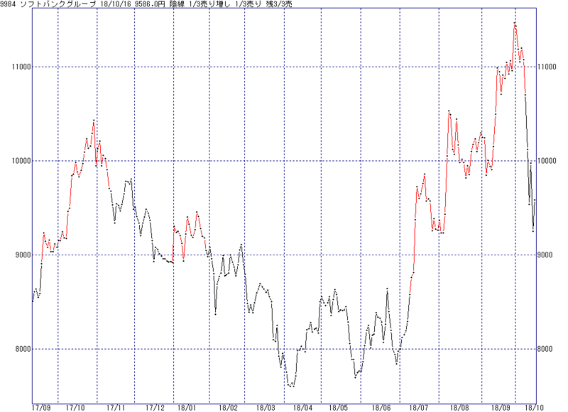 大きな上げのあと、10月の下げで陰転して急落しています。相変わらず、中源線との相性はいいようです。さまざまなニュースが株価に影響する銘柄なので、転換の際に急激すぎるのが気になりますが、中源線で売買するには魅力的といえます。