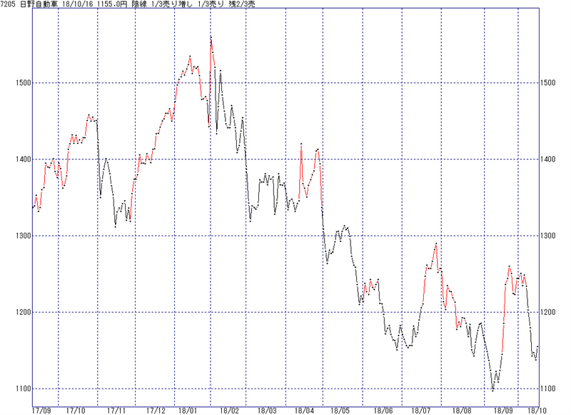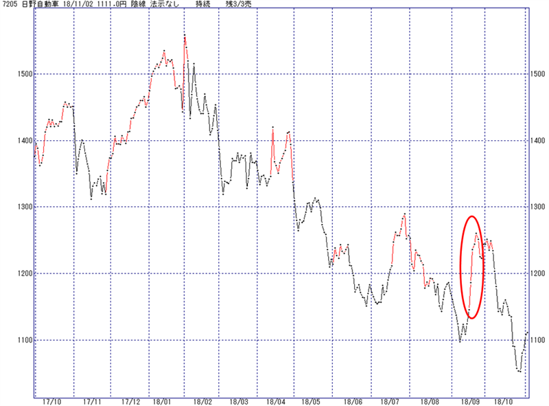 7205日野自動車です。9月の陽転(赤い丸印)について「期待できるかも」とコメントしたのですが(10月放送)、10月に下げたことで結局はダマシに終わりました。結局、2月から9カ月も下げているので、次に陽転したら「こんどこそ」というところでしょうか。