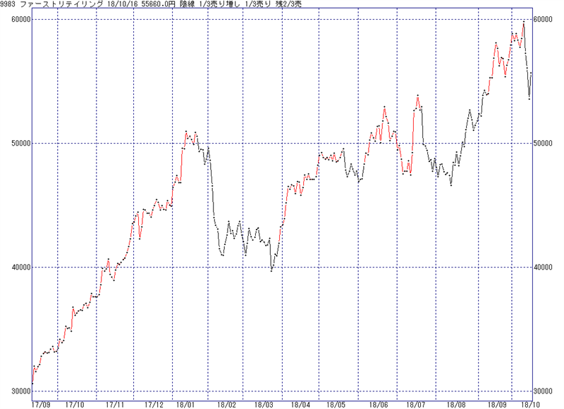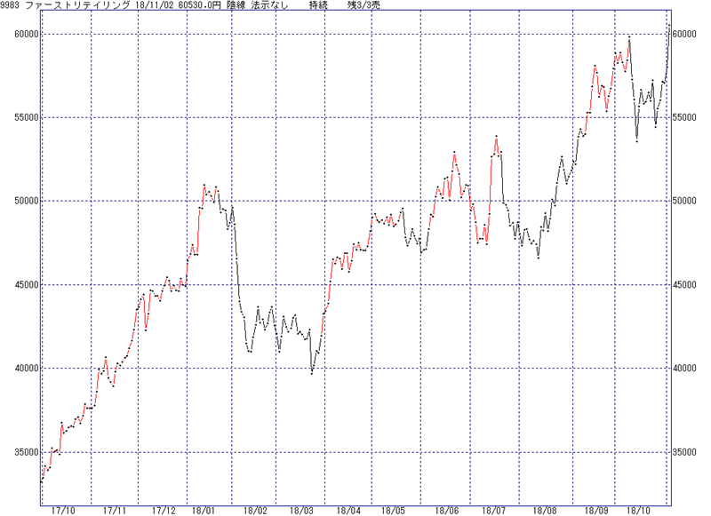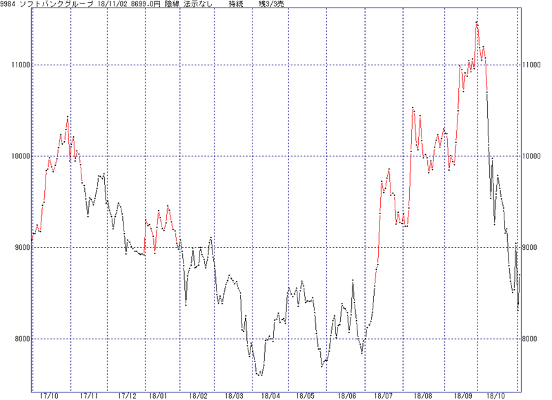 9983ファーストリテイリングは、10月11日に陰転したのですが、そのあと下げないどころか高値を取っています。ところが、中源線がうまく反応せず、陰線のまま強張るという状況にあります。中源線はロジックがシンプルな半面、単純な価格水準で反応しないこともあります。頻度は低いのですが。