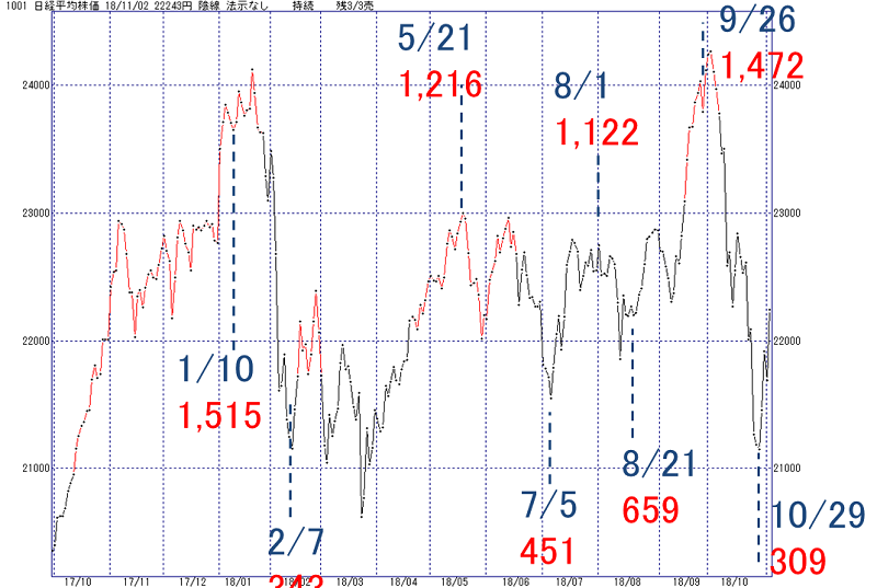 とはいえ、日経平均は東証一部225銘柄の平均ですから、注目すべき個別銘柄の動きと全く無関係ではありません。両者の関係を見てみましょう。