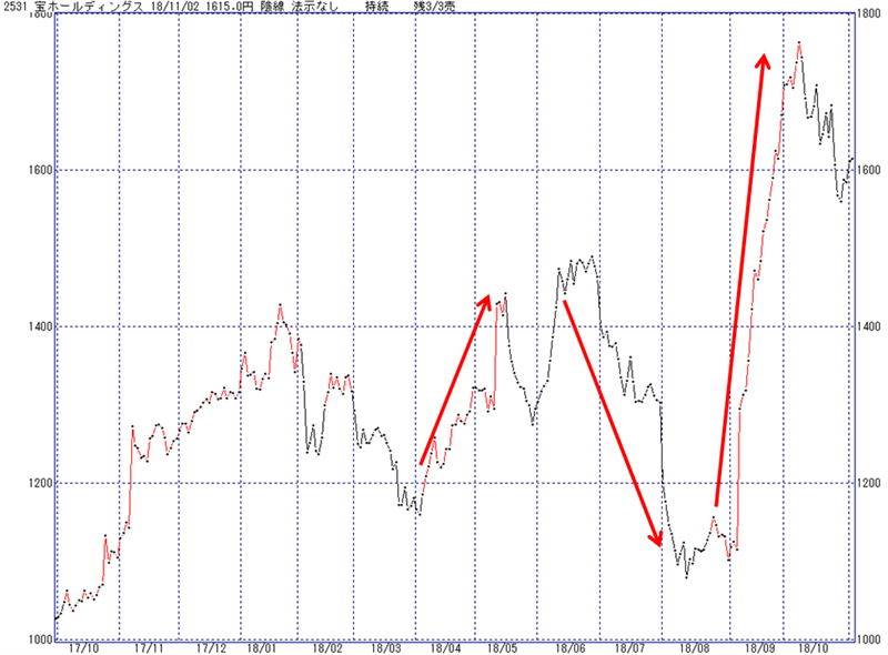 上のチャートは、2531宝HDです。中源線が、上げ下げをうまく捉えています。