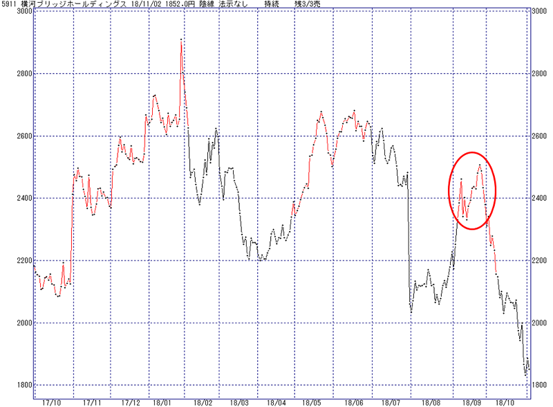 5911横河ブリッジは、前にもコメントしたように、最近はきれいなうねりが出ていますが、9月の陽転(赤い丸印)は少し残念でした。ダマシは仕方がないのですが、陽転のタイミングが少し遅れ気味でした。また、10月の陰転も少し遅めだったと感じます。