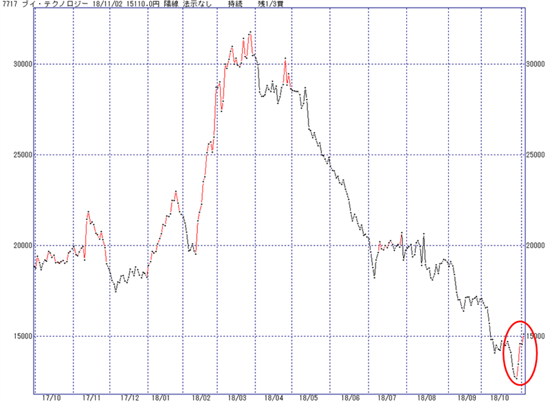 7717ブイ・テクノロジーは、イヤな下げ方をみせています。7月にいったん下げが止まったところでダマシの陽転が2回あったあと、さらにズルズルと下げました。しかし、10月の下げのあとは、ほかの銘柄に比べて早いタイミングで陽転しています(赤い丸印、10月30日に転換)。半年以上におよぶ下げのあとなので、おもしろいかもしれませんね。大橋ひろこさんが得意な銘柄です。
