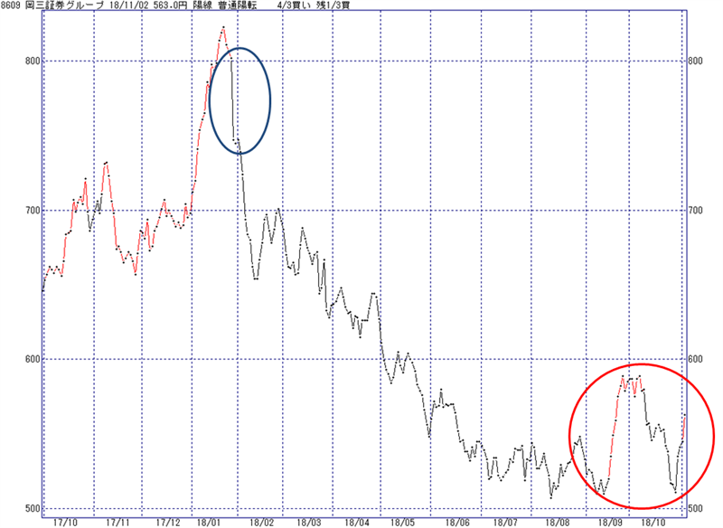 8609岡三証券グループです。これこそ、長い下げのあとなので、どうなるのか興味津々ですね。1月の陰転(青い丸印)から約8カ月の下げを経て9月に陽転したのですが、10月の下げで再び陰転……残念ながらダマシでしたが、11月2日に「こんどこそ」という雰囲気で陽転しています(赤い丸印=9月の陽転以降)。