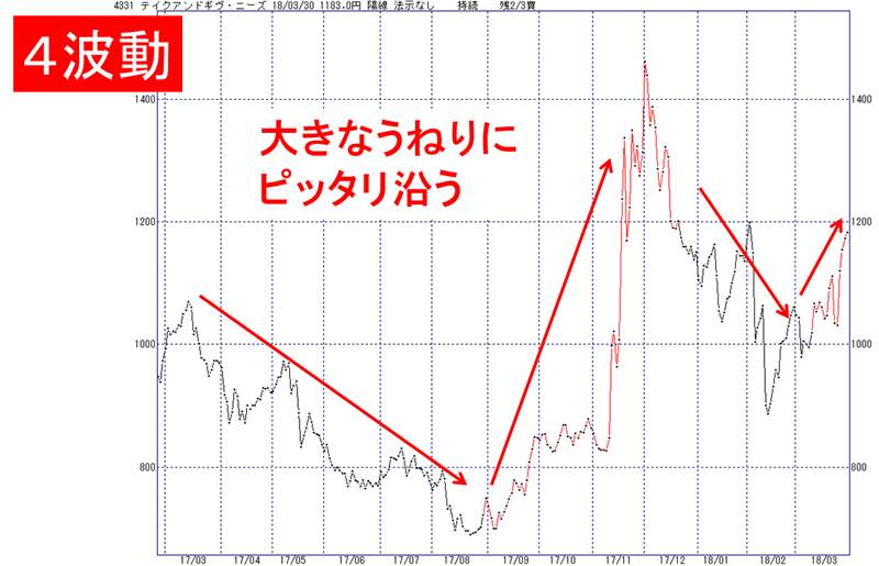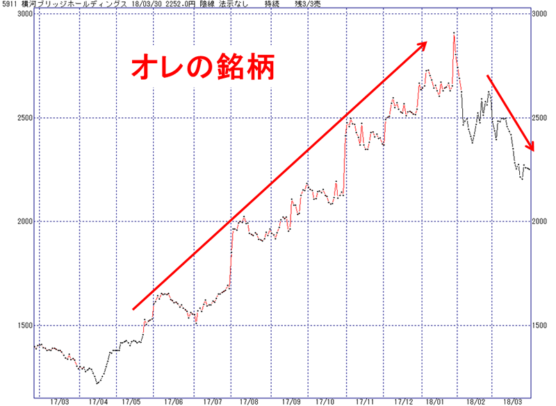 5911横河ブリッジは、動き始めるとトレンドを出す場面が多い銘柄のひとつです。この期間、約1,000円幅を取る見事な結果を出しています。