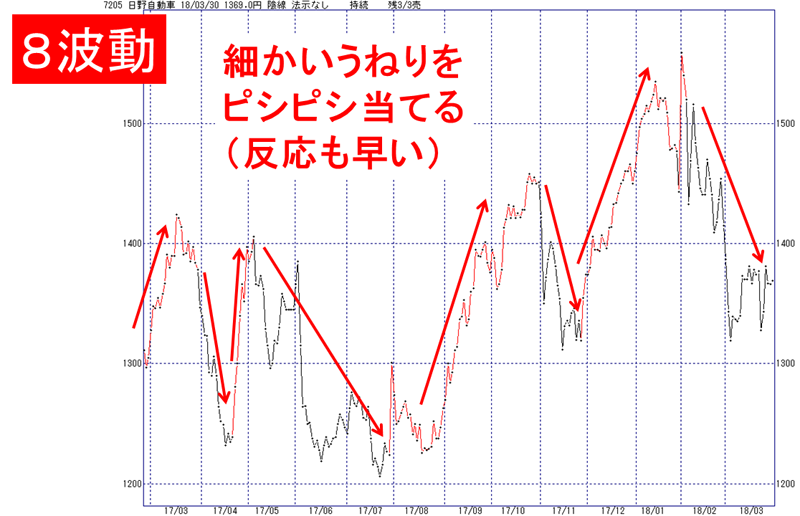 でも以前は、値幅が出たのに中源線の判断が微妙にズレて、なんとなくガッカリな結果になることがありました。「転換が遅れる場面が多いよなぁ」と感じるケースが多かったのです。