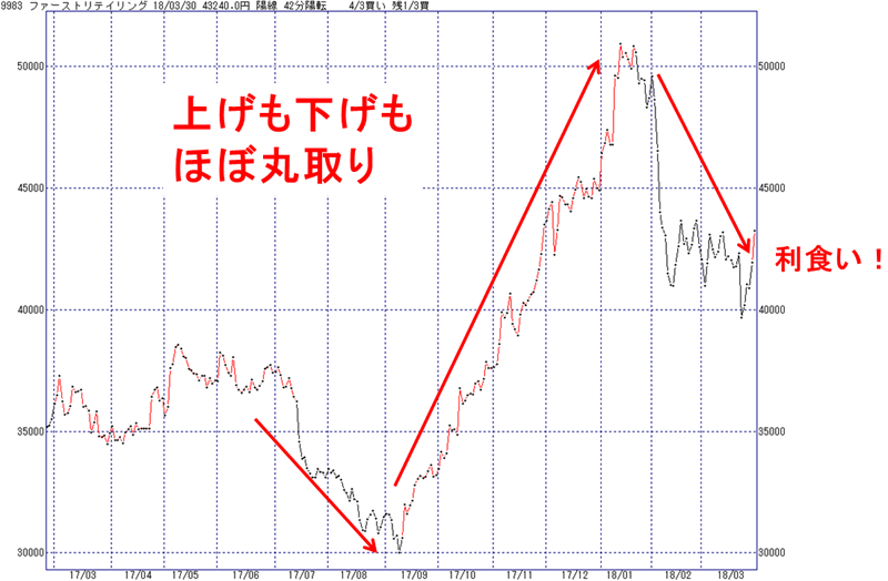 2つめのファーストリテイリングは、この期間、全体的に見事に取れています。特に、中央の上げなんてヨダレが出てしまいます。