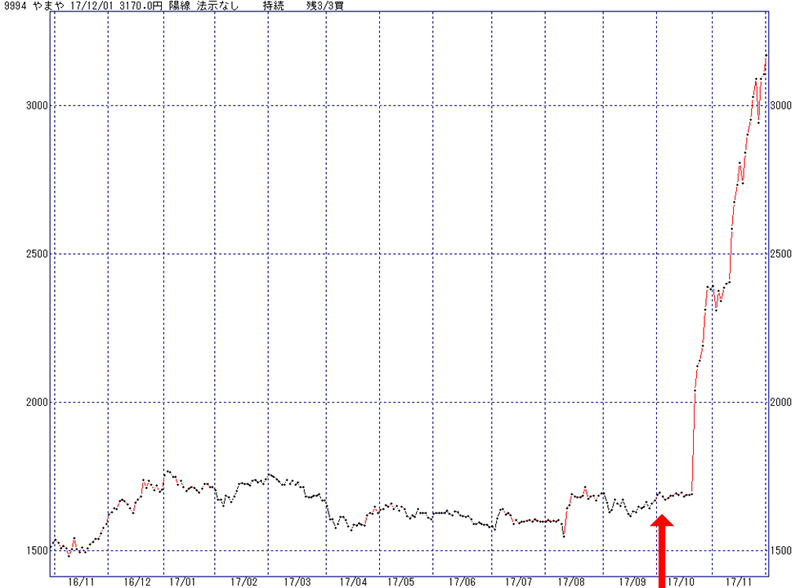 結果としては見事に大当たりですが、年初に「ずっと買いを維持する」と決めたわけではありません。たまたま陰転する場面がなかった、というだけのことです。そして、個別銘柄の推移は、同じように上昇しているものあり、動きがないものあり、ガンガンと上伸したものあり、大暴騰のあと強烈に下げたものあり……。