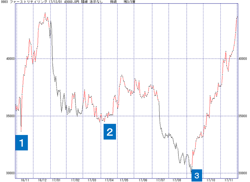 「1」のあと一時的に大きく上伸していますし、「3」では、TOPIXが“上抜き”なのに対してファストリは“下げからの急な切り返し”です。
