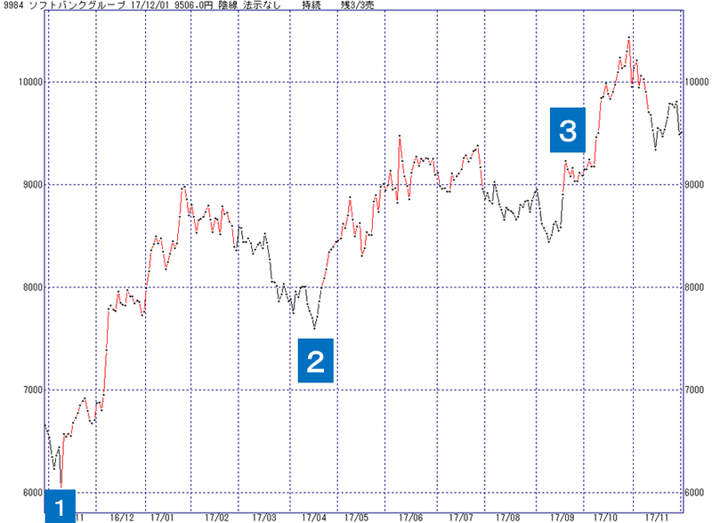 林投資研究所の情報サービス、「中源線シグナル配信」のチャートで、TOPIX(東証株価指数)と、よく解説で取り上げられる2銘柄、ファーストリテイリングとソフトバンクのチャートをご覧ください。