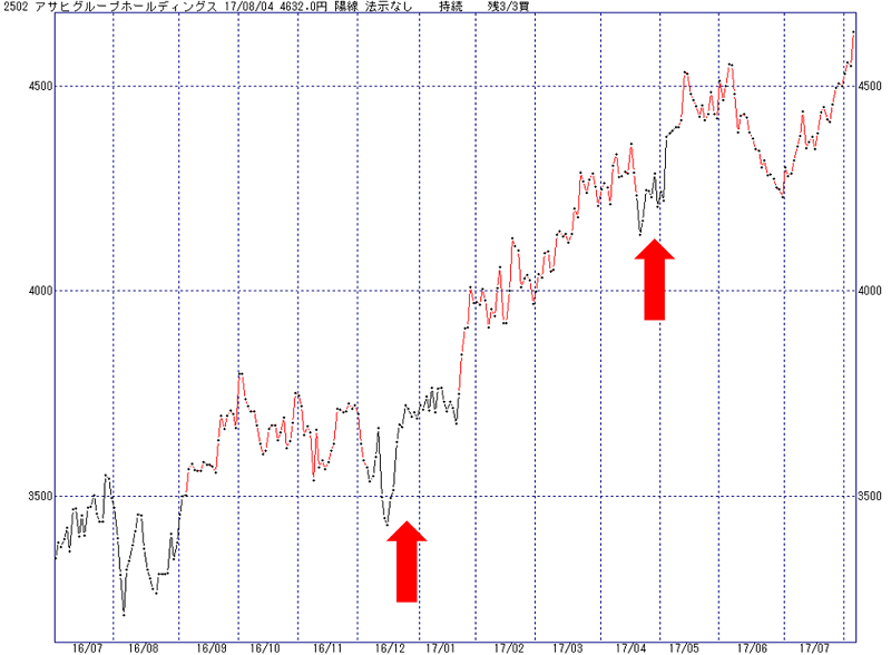 この上げを、中源線はうまく捉えています。とはいえ、2017円1月には、先の三菱重工と同じように、一時的に陰転している場面があります(赤い矢印)。あとから見れば「ダマシだ」「不要な売り買いがあった」となるのですが、この弱含みのあとに下落が続くケースもあるので、いったん売りに転じる、再び強張ったところでドテン買う、といった対応は、多くの投資家が注目すべきものです。