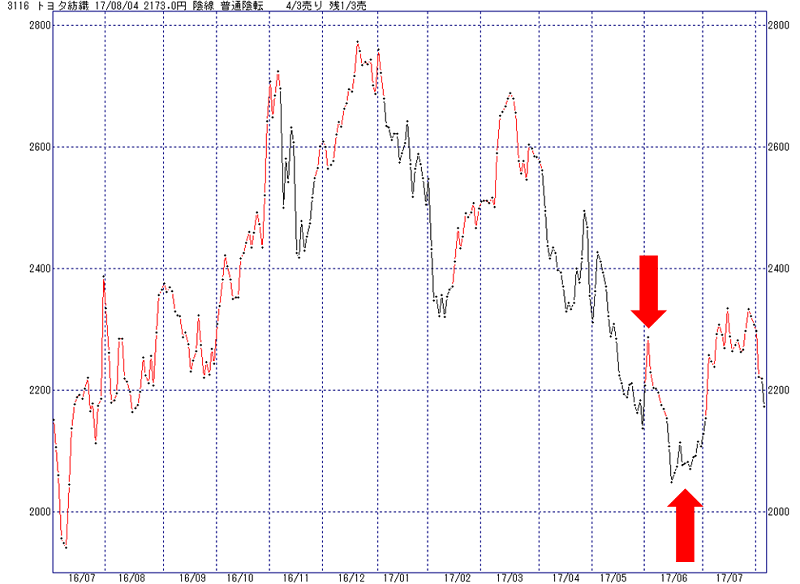 ちなみに、2017年7月に入ってからの下落は、うまく売りポジションをつくって乗っています。この原稿を書いている8月15日現在も、陰線(売り線)のままです(8月14日大引)。