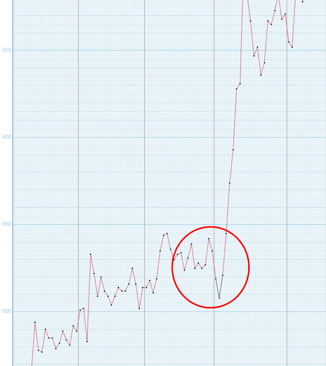 しかし、中段で2回、ダマシの陰転がありました(赤い矢印)。