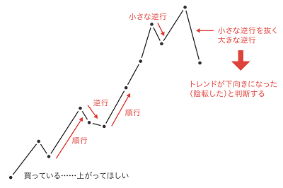 そして、図のような「逆行と逆行の組み合わせ」でトレンド転換を判断するのですが、値幅についてカチッとした数式が定められています。