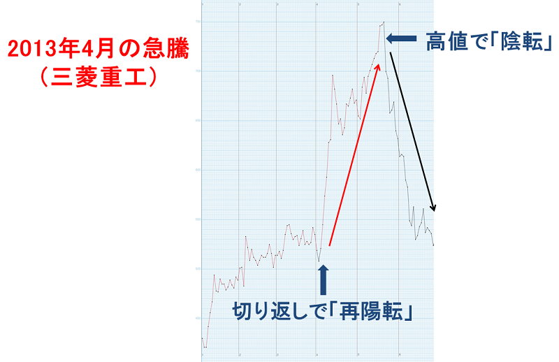 5月の高値に向かって上げる際に素早く陽転(買い転換)し、高値からの急落一発目で陰転(売り転換)しています。なかなかうまく機能した例ですが、陽転で急騰に乗った部分に注目してほしいのです。下に示すのは、4月の値動きを拡大したチャートです。