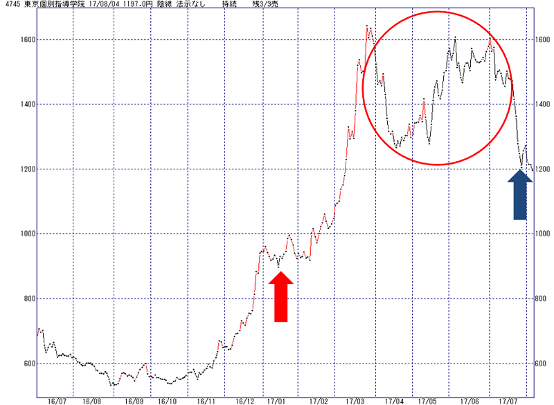 東京個別指導学院は、2016年11月下旬に陽転し、2017年3月の高値まで暴騰しました。