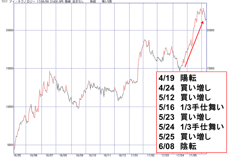 今まで陽線(買い線)だったものが、この日の大引で陰転、つまり買いから売りへと判断を変えたわけです。
