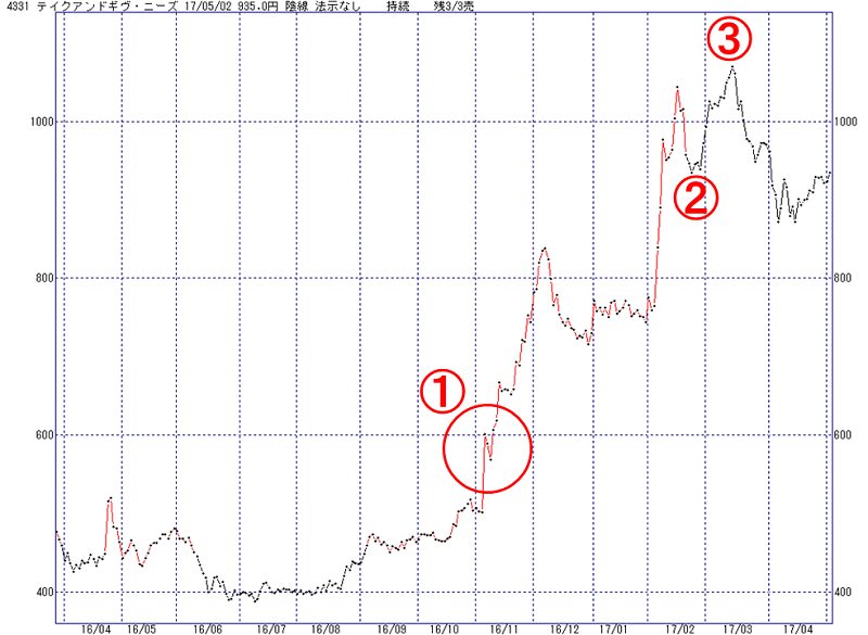 テイクアンドギヴ・ニーズは、2016年11月9日の急落で陰転しませんでした(1)。9月に陽転してモタモタしていたところ、11月に入ってから上げが加速し始め、12月と2017年1月の保合でも陰転せず1,000円超まで上伸しました。
